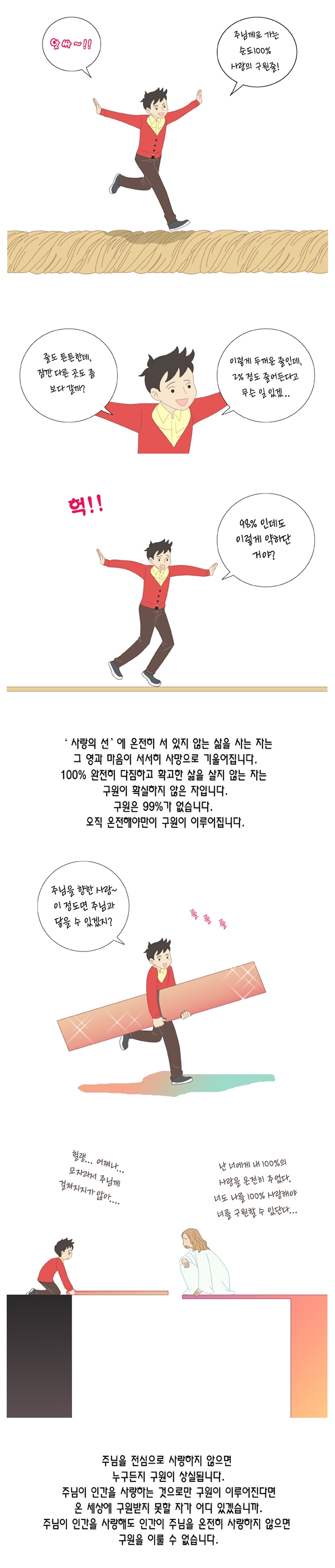 ▶ 100개 중에 90%는 모르고 약 10%를 안다고 하면 돼요. 우리가 꼭 물에 떠내려갈 때 건져주면 나 살았다고 실감있게 간증합니다. 그러나 안 떠내려간 사람들은 간증을 안 하죠. 그 사람들은 아예 물에 안 떠내려가게 해줬으니 감사해야해요. 사람들은 꼭 길가에 가다가 나쁜 불량배에게 맞고 있을 때 그 때서 말리고 구해주면 너무 너무 충격적으로 감격하고 좋아합니다.